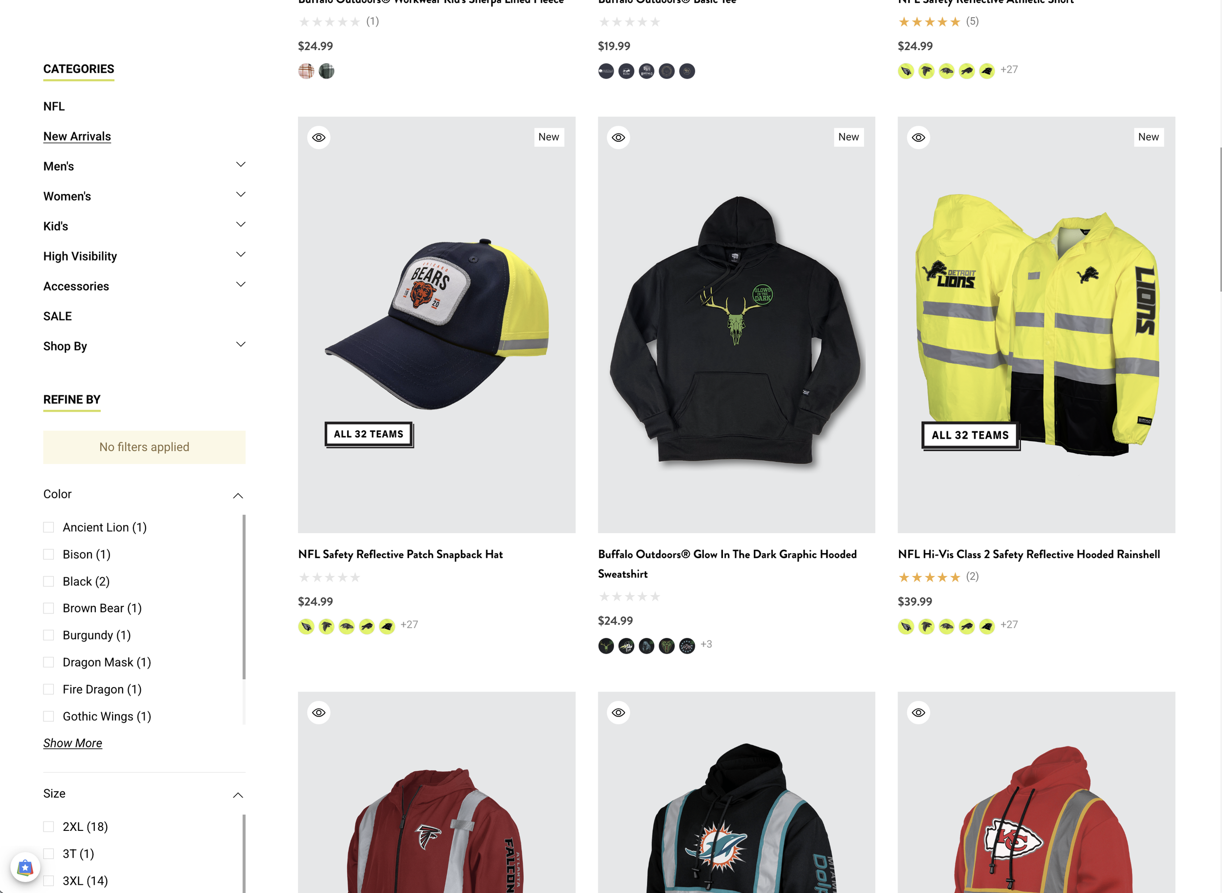 I also worked closely with web manager to refresh and revamp our website in anticipation for even more online traffic/order volume with acquisition of our NFL license. I started by mapping out each page template in Adobe Photoshop, then exporting all elements and handing off to Web Manager for building. I assisted with HTML/CSS (as needed) and provided updates to the Director of Marketing during each step in the process. I provided feedback to the Web Manager to make sure website stayed within guidelines of the Buffalo Outdoors branding. Using a timeline tracker, we stayed on schedule for launch date of mid June 2024, before the Buffalo Outdoors x NFL launch date in July 2024.