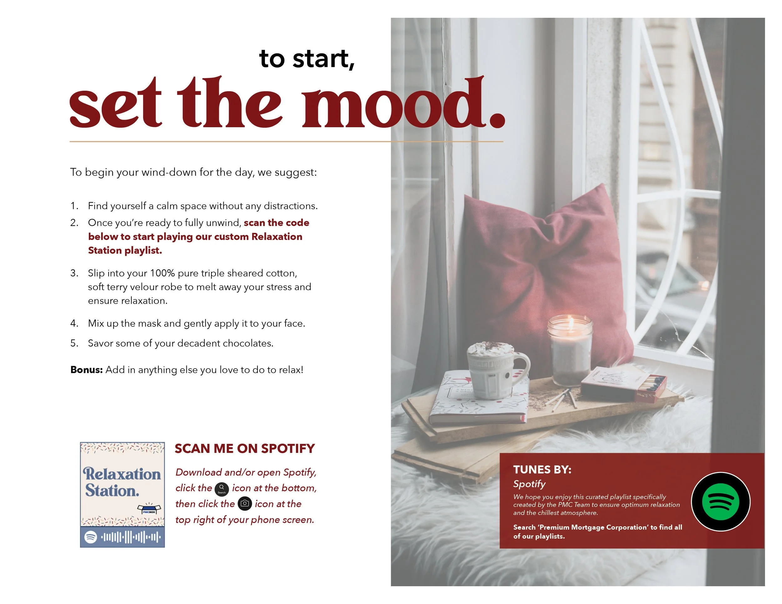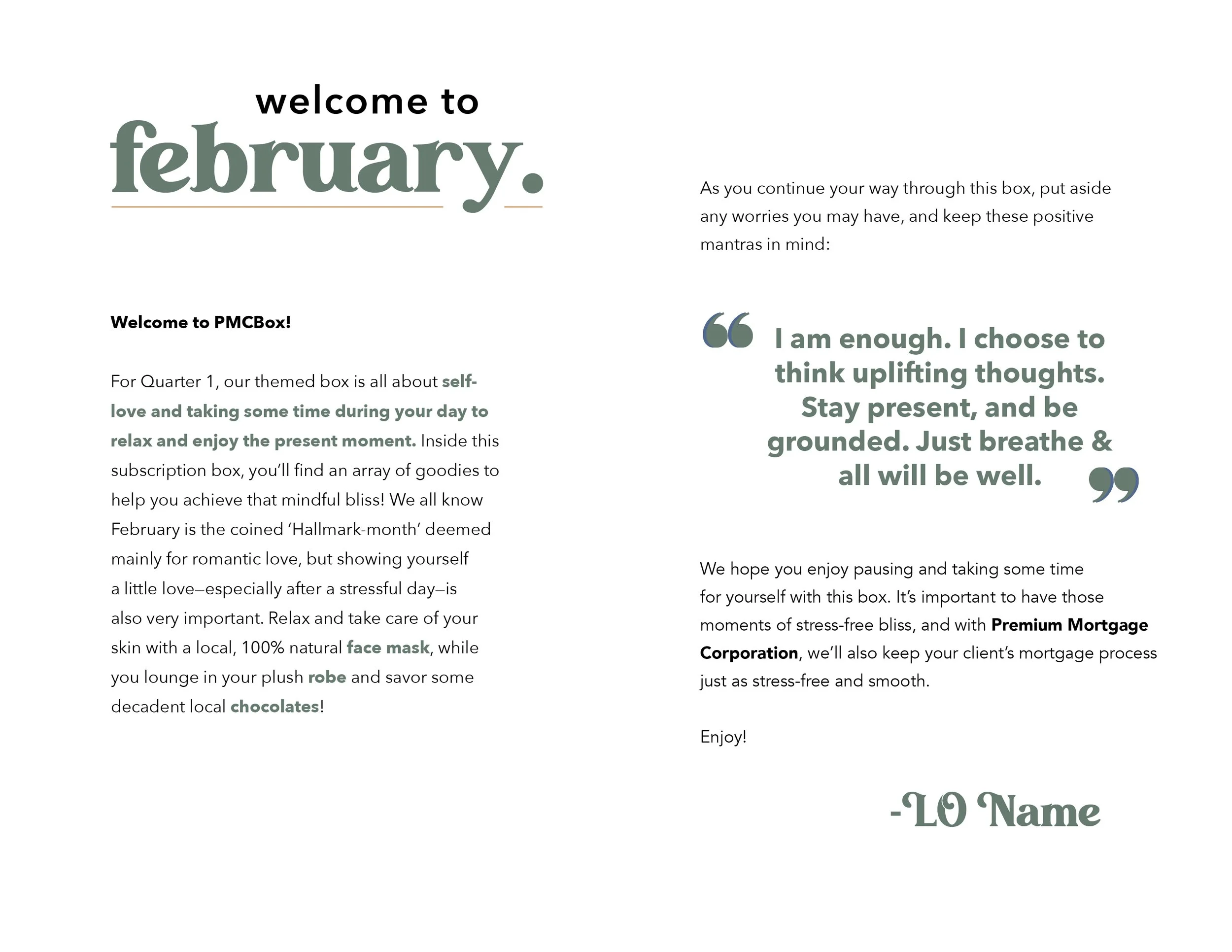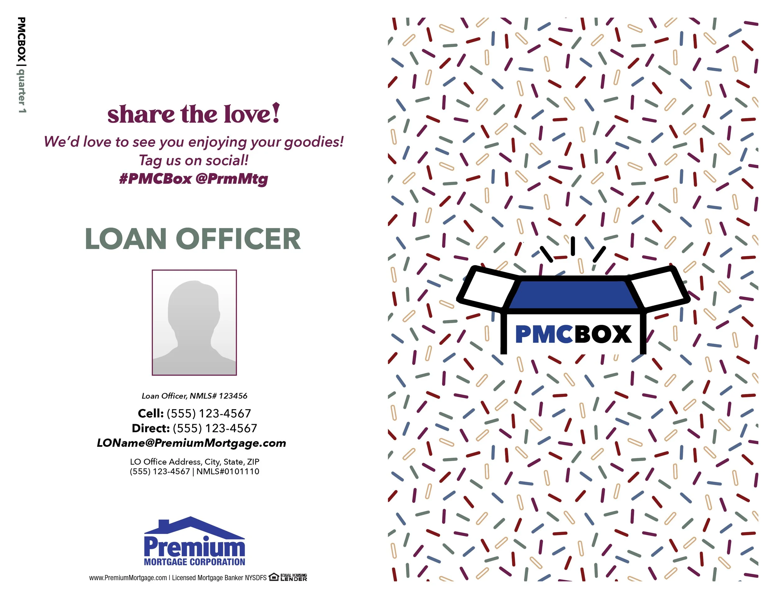 Among various design and marketing projects during my time at PMC, PMCBox was the main project I co-spearheaded. PMCBox was created as a unique sales tool for Premium Mortgage Corp.’s salespeople to stay connected with their real estate business contacts during a time where face-to-face interaction was limited. I created the booklet layout (inspired by current magazine/subscription box collateral layouts), wrote booklet copy, and created PMCBox logo & “sprinkle” motif used on cover of booklet as well as on stickers used as additional branding, and to keep the box sealed during transport.